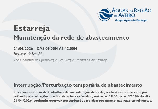 Manutenção da rede de abastecimento no Município de Estarreja obriga à suspensão temporária do abastecimento