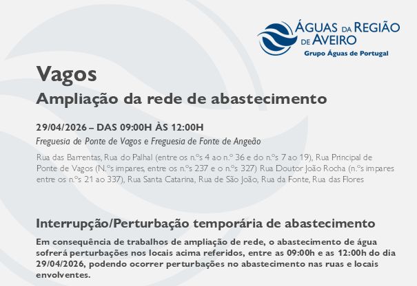 Para prosseguir com trabalhos de ampliação da rede de abastecimento é necessário intervir na Freguesia de Ponte de Vagos e na Freguesia de Fonte de Angeão.