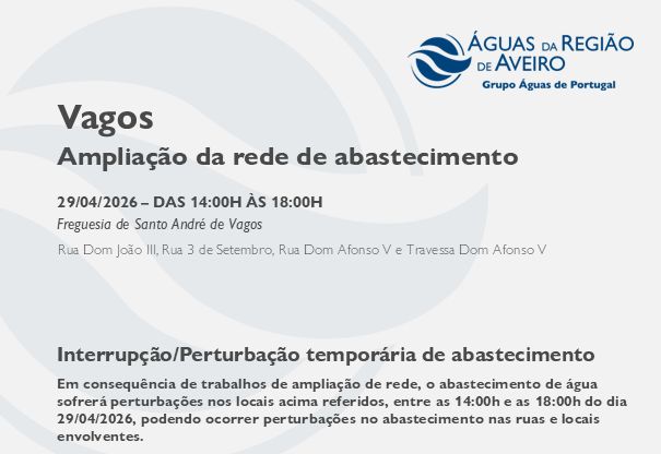 Ampliação da rede de abastecimento no Município de Vagos obriga à suspensão temporária do abastecimento.