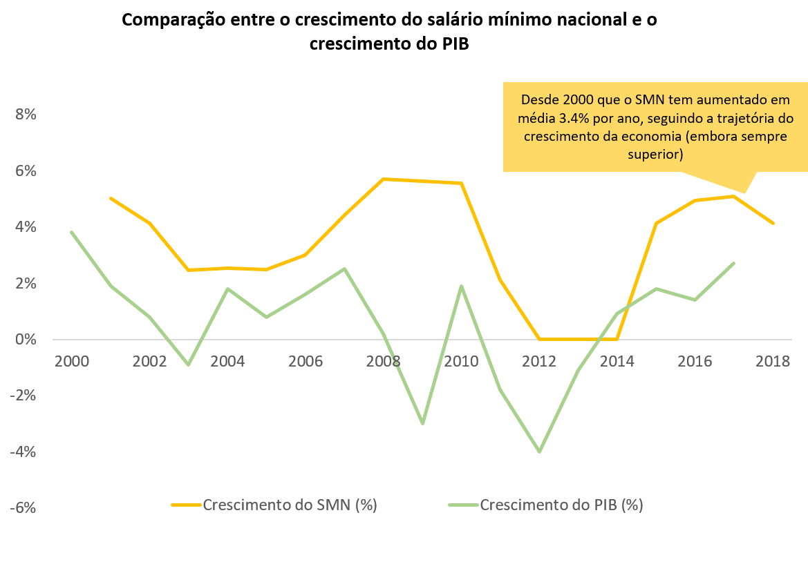 • Salário mínimo nacional pode aumentar para €600: Vai ser proposto em consertação social o aumento do salário mínimo nacional (SMN) para €600 em 2019. Isto pode representar um aumento anual de 3,4% (€347 por trabalhador), o que está em linha com os incrementos registados nos últimos 18 anos (excl. os anos de 2012, 2013 e 2014). Historicamente, o crescimento do SMN tem seguido de forma próxima o crescimento da economia (embora superior).
