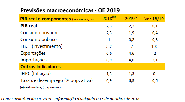 O enquadramento macroeconómico previsto pelo Governo aponta para um crescimento do PIB de 2.2% (um abrandamento face a 2017 e 2018) devido a um abrandamento generalizado da atividade económica, em particular das exportações e do consumo privado.